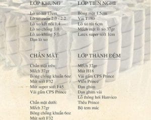 lò xo thép nguyên chất, Lớp bông ép polyester, Lớp cao su tự nhiên, Lớp mousses cường lực, Sơ dừa tự nhiên, Vải cây lô hội Aloe, Vải gấm Damask, Vải Tecel nhập khẩu